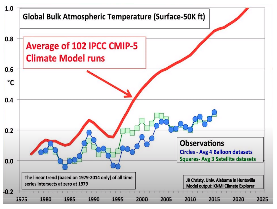 Die blaue und die grüne Kurve sind die real gemessenen Daten (Wetterballon, Satellit). Wie man sieht, ist die Differenz zwischen den realen Werten und dem Modell erheblich.